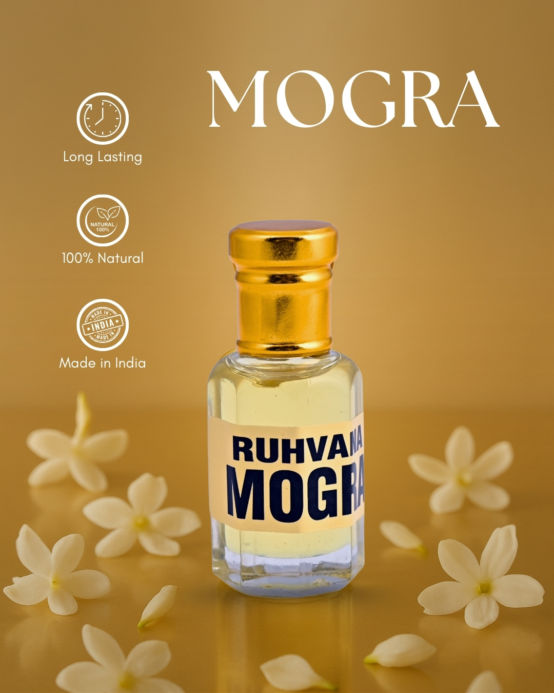 Mogra attar, derived from jasmine blossoms, is one of the most beloved floral fragrances in India. Its aroma is fresh, sweet, and sensual, carrying the natural beauty of blooming jasmine. With its intoxicating yet soothing fragrance, Mogra has been used for centuries in rituals, weddings, and daily wear. It’s refreshing and graceful scent makes it a timeless favourite across generations.