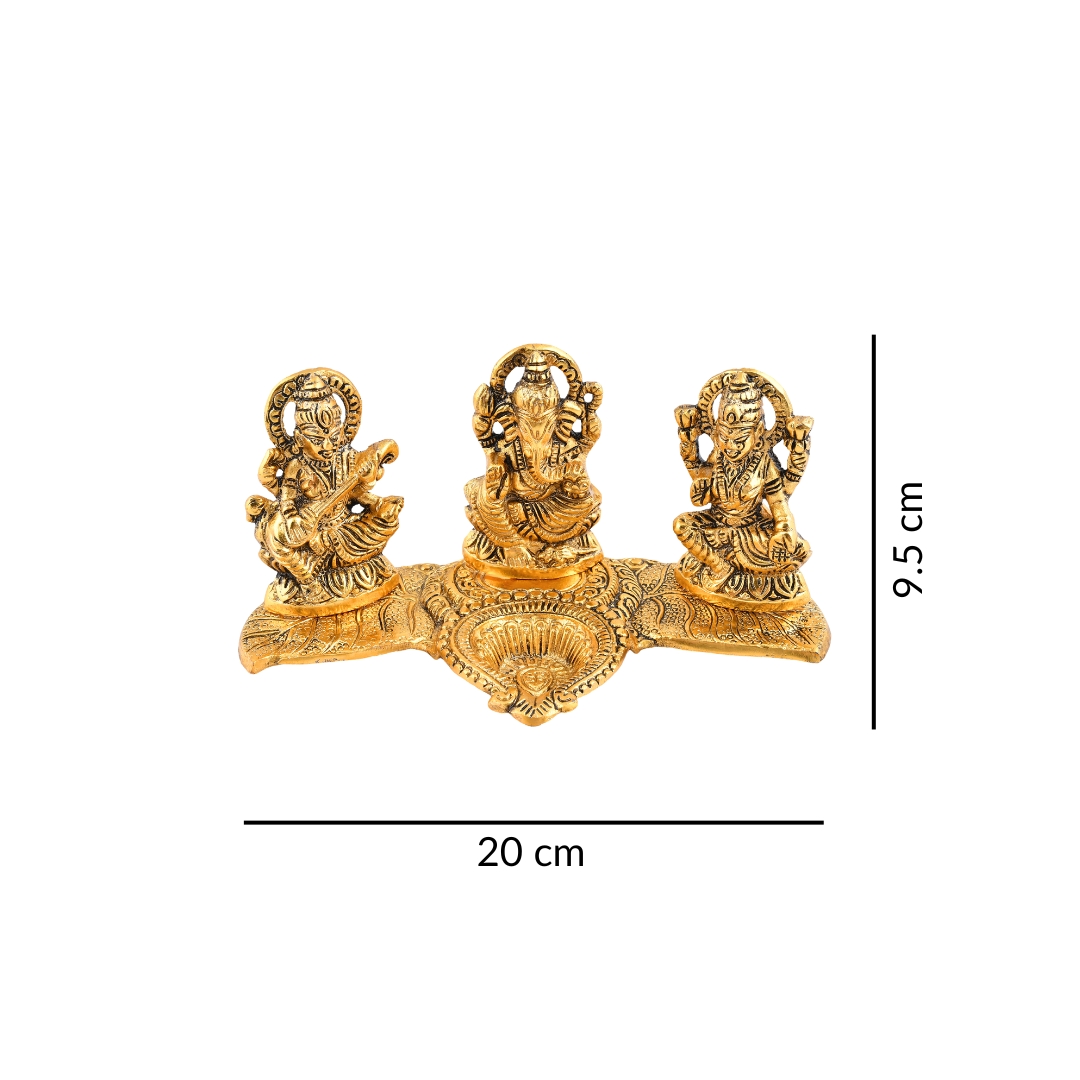 Invite prosperity, wisdom, and knowledge into your home with this beautifully designed Lakshmi Ganesh Saraswati Idol in Oval Shape. Crafted from durable Aluminium Metal with a rich golden finish, this idol set measures 9.5 cm in height and 20 cm in length while weighing only 310 g, making it both compact and elegant.