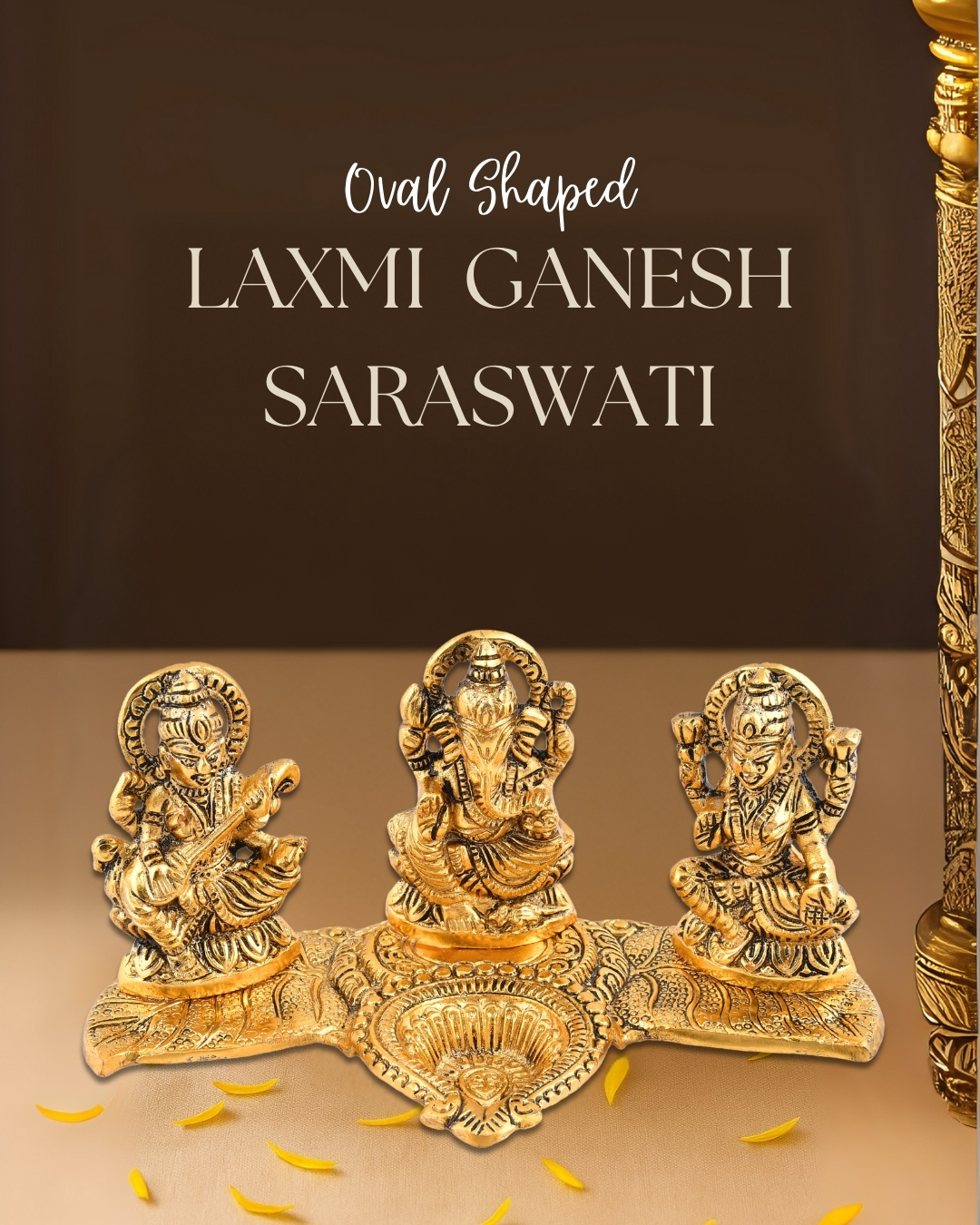 • Divine Trio Idol: Features Goddess Lakshmi (prosperity), Lord Ganesha (wisdom & success), and Goddess Saraswati (knowledge) seated together on an oval-shaped base.