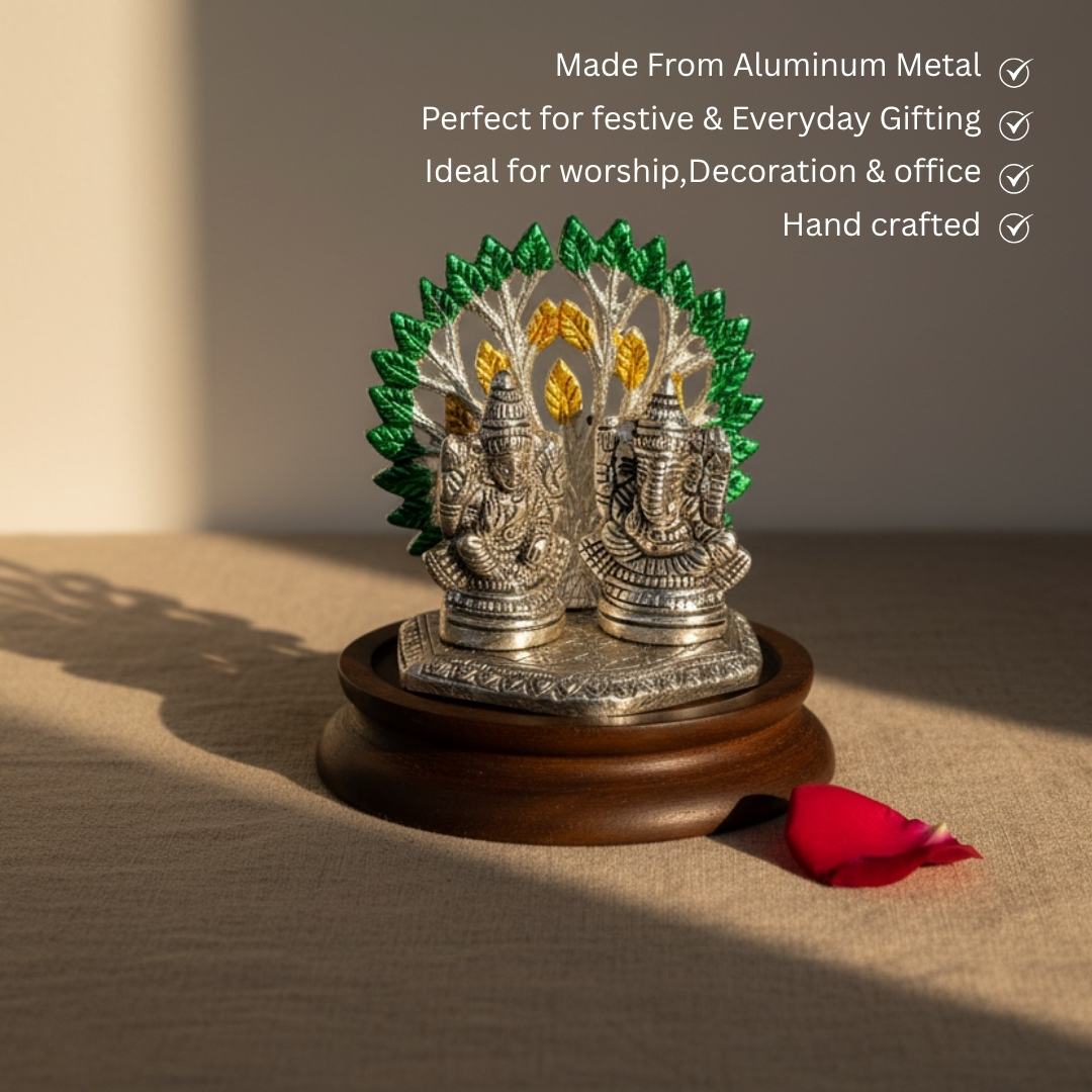 The idol features Goddess Laxmi (symbol of wealth) and Lord Ganesh (symbol of wisdom) seated under the sacred Kalp Tree, representing prosperity, harmony, and success. Its detailed craftsmanship and silver polish make it a spiritual as well as decorative centrepiece.