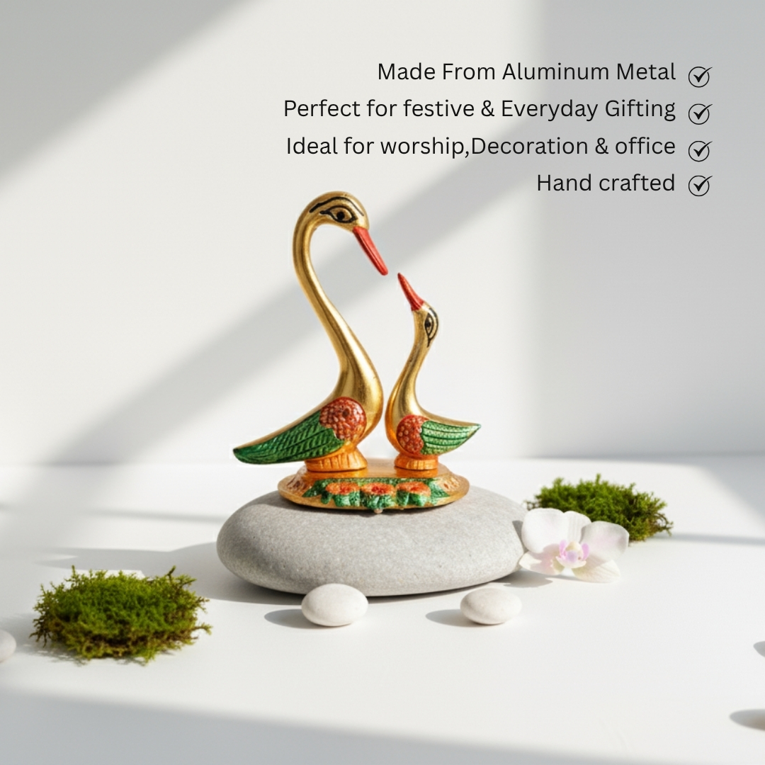 The swans feature hand-painted mina artwork in vibrant red and green colours, enhancing their aesthetic appeal. Representing love, grace, and harmony, this swan couple makes an ideal addition to your living room, showcase, pooja room, or office table.