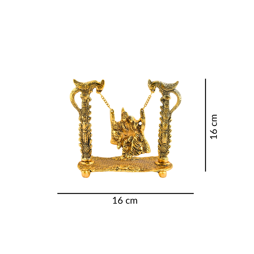 • Radha Krishna on Swing Jhula (Golden Finish) || Dimensions – 16 x 16 cm || Weight – 330 g || Material – Aluminium Metal