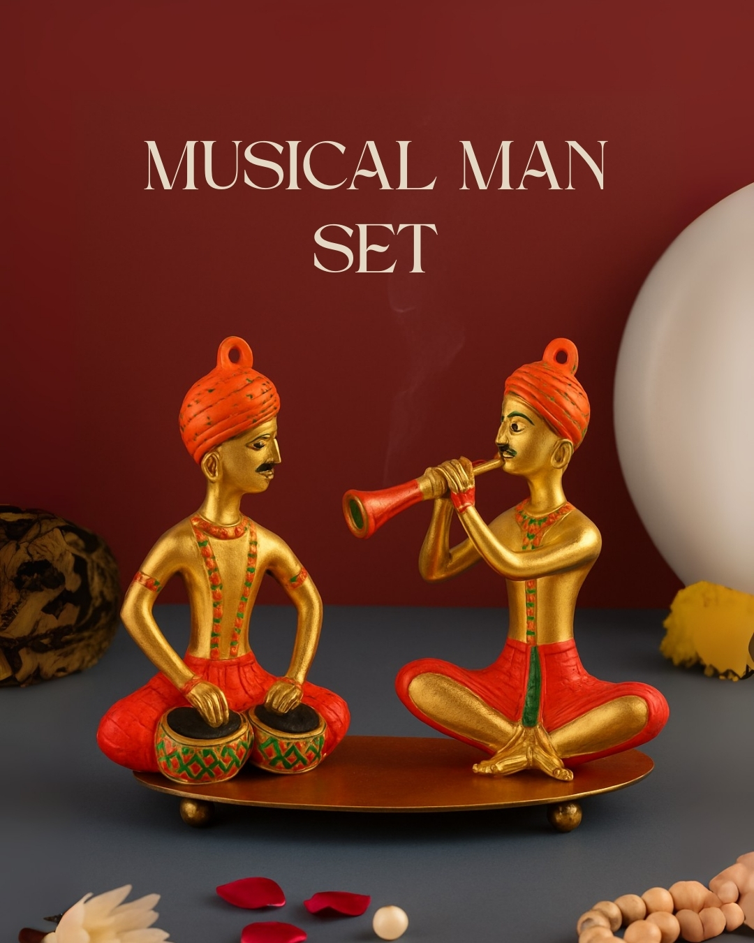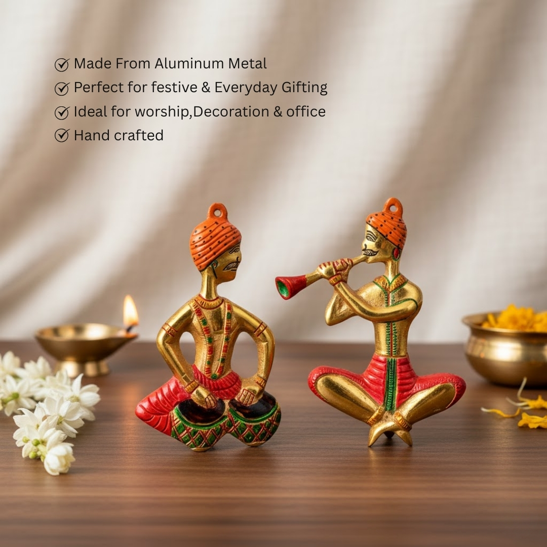 Add a touch of tradition and music to your walls with this Rajasthani Musical Man Wall Hanging Set. Handcrafted from durable aluminium with a golden finish and detailed mina painting, this set depicts musicians playing dholak and shehnai, reflecting the rich heritage of Rajasthan.