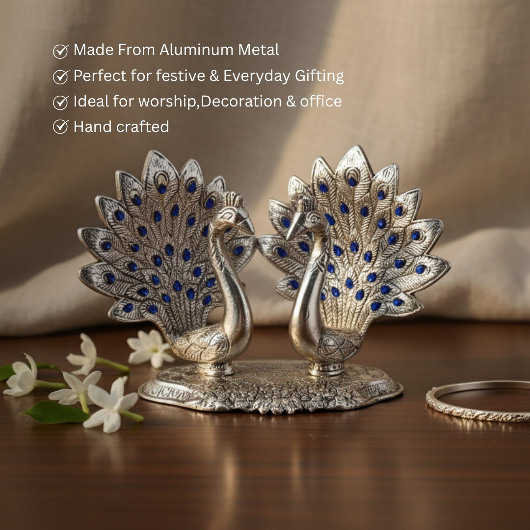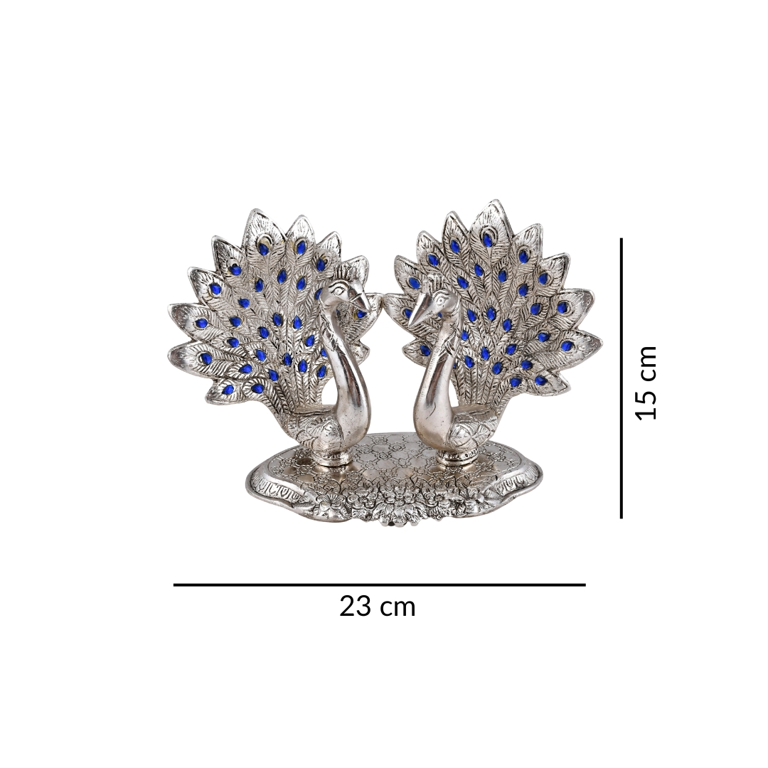 Enhance your home with this Silver Aluminium Double Peacock Showpiece, a stunning blend of tradition and elegance. Featuring two finely crafted peacocks with beautifully detailed feathers and blue highlights, this piece radiates sophistication and charm.