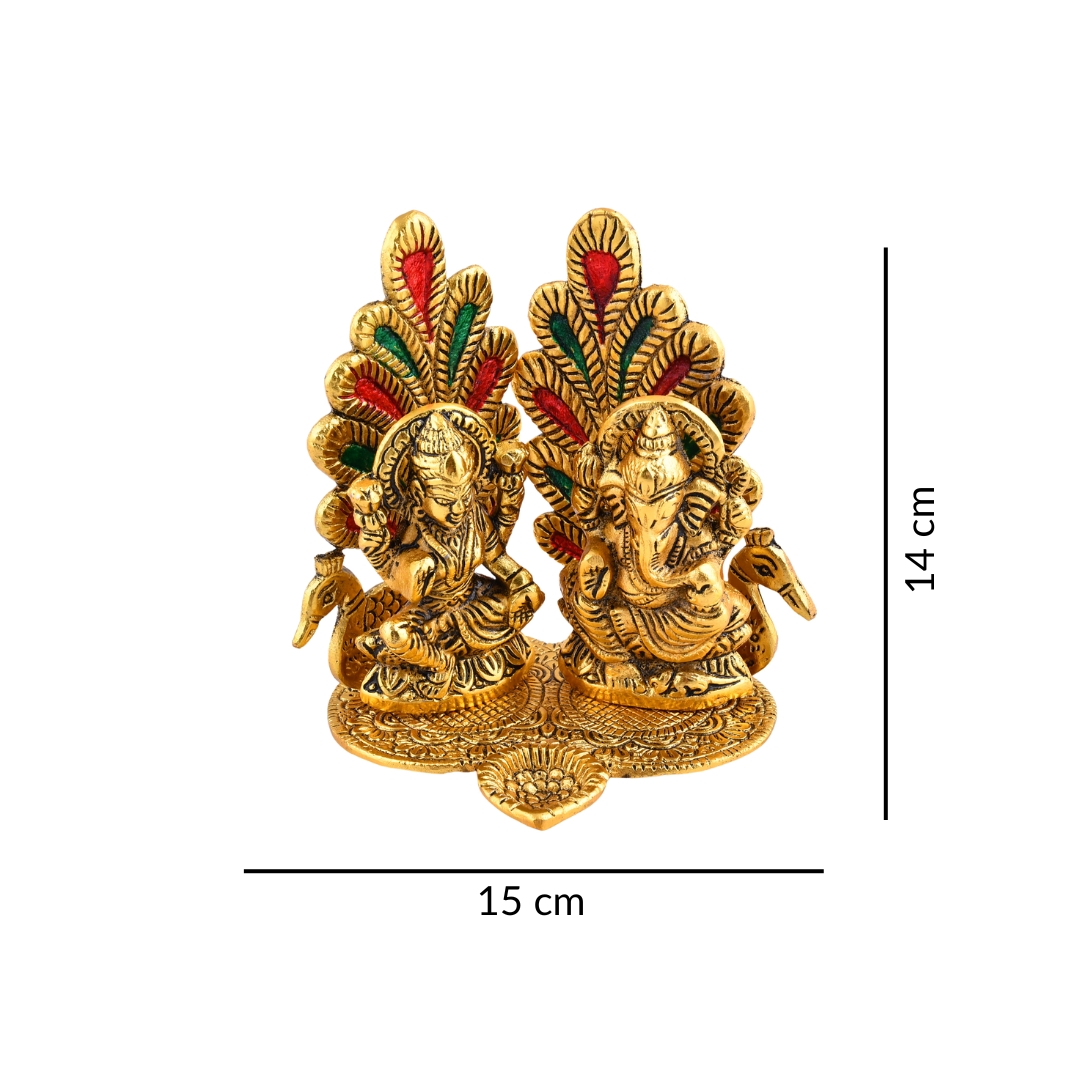 • Laxmi Ganesh Idol with Peacock Design (Golden Finish, Hand-Painted) || Dimensions – 15 x 10 x 14 cm