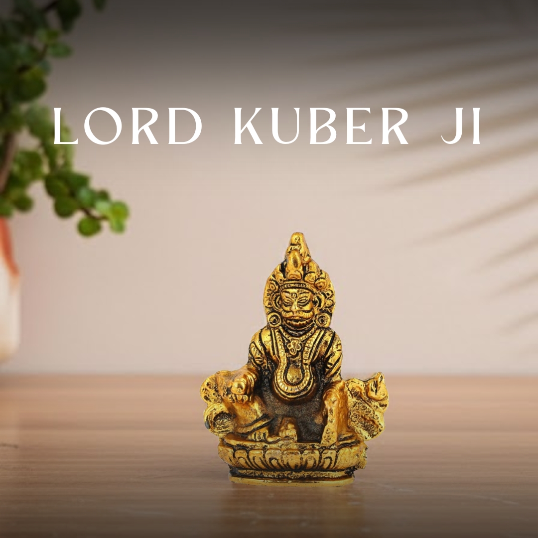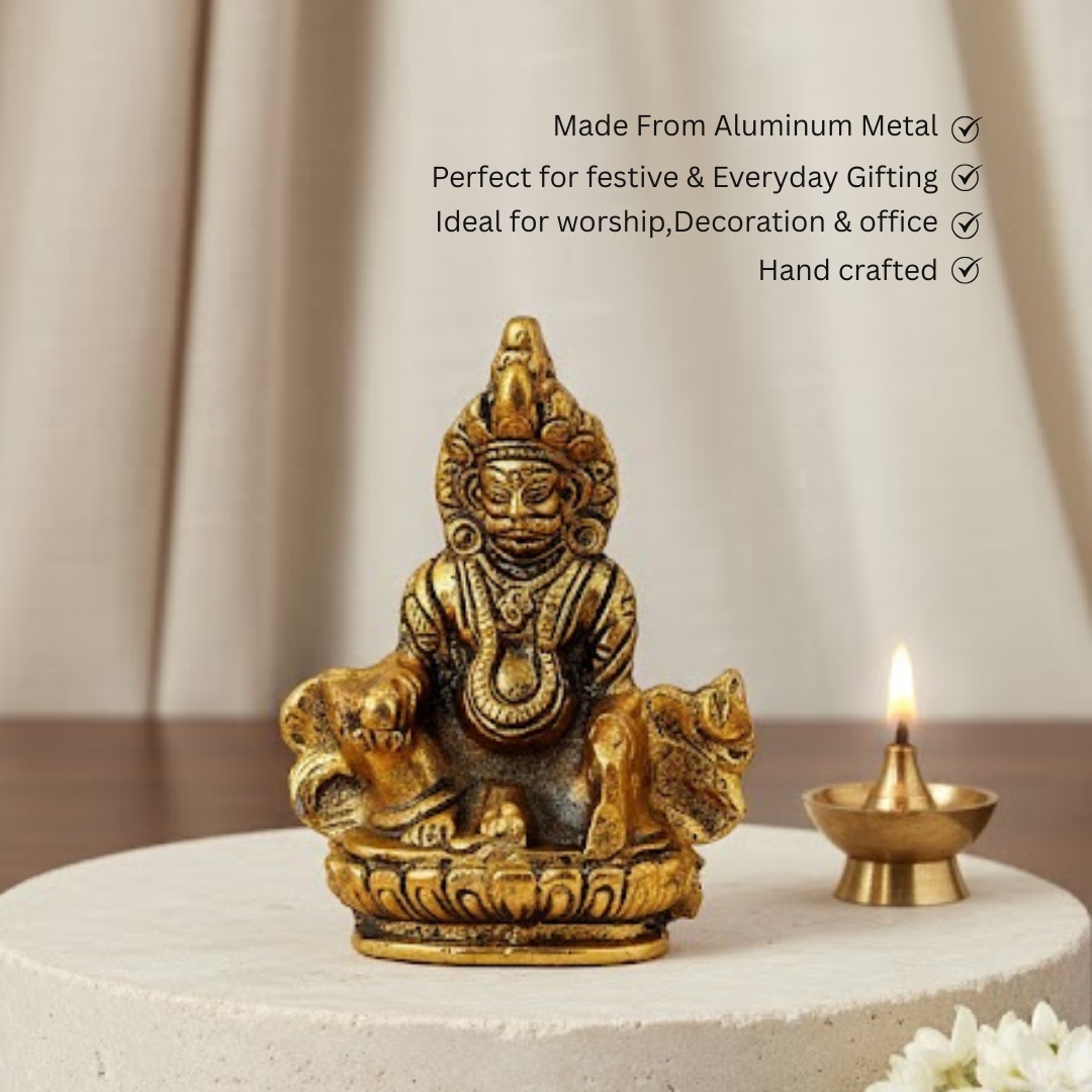 This finely crafted Lord Kuber Ji idol radiates divine prosperity and abundance. Made from superior-quality Aluminium Metal with a lustrous golden finish, it reflects artistic precision and spiritual symbolism. Measuring 15.5 cm in height, 11 cm in length, and 8 cm in width, the idol portrays Lord Kuber—the celestial treasurer—seated majestically, blessing devotees with wealth and positivity. The smooth metallic sheen and intricate detailing highlight the exceptional craftsmanship that gives this piece its divine character. Perfect for homes, offices, or pooja spaces, it serves as a sacred focal point for daily worship and meditation. Its elegant design also complements modern interiors, blending spirituality with style. As a thoughtful gift for Diwali, weddings, or housewarmings, this idol conveys best wishes for success, prosperity, and peace. Maintain its brilliance effortlessly with a gentle wipe of a soft, dry cloth. A symbol of fortune and divine grace, this Lord Kuber Ji idol brings an aura of stability and abundance wherever placed.