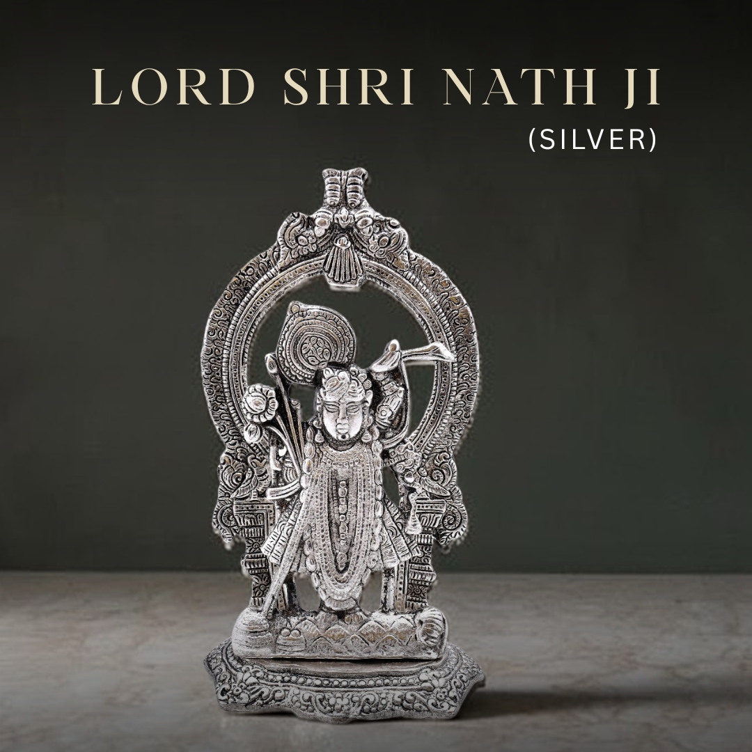 Celebrate divine grace with this elegantly handcrafted Lord Shree Nath Ji idol, made from superior Aluminium Metal with a premium silver finish. Measuring 23 cm in height, 13 cm in length, and 8.5 cm in width, it depicts the divine form of Lord Krishna as Shree Nath Ji, symbolizing love, protection, and eternal devotion. The craftsmanship captures fine detailing of his adornments, posture, and serene expression, creating a spiritually uplifting presence. Its elegant silver sheen complements both traditional and modern décor, making it ideal for pooja rooms, showcases, or home entrances. The idol embodies artistic excellence and sacred symbolism, inspiring peace and divine harmony in any environment. It also serves as a perfect devotional gift for festivals like Janmashtami, Diwali, or auspicious occasions such as weddings and housewarmings. Easy to maintain and long-lasting, simply wipe with a dry cloth to preserve its divine shine. This Shree Nath Ji idol is a timeless symbol of devotion and aesthetic refinement.