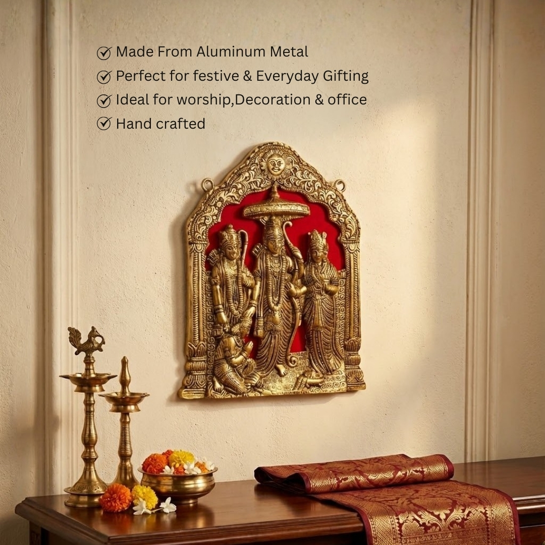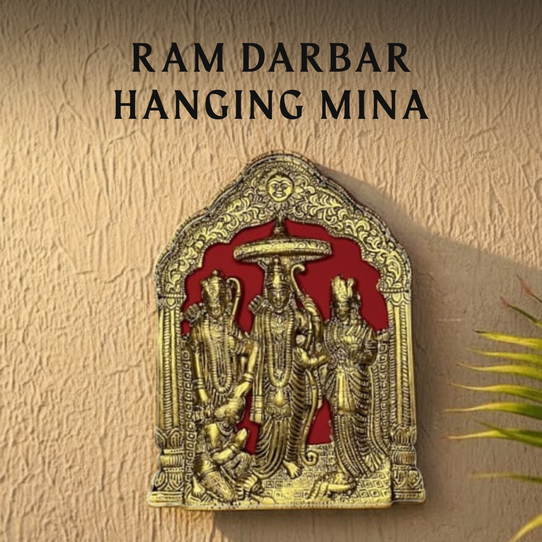 Celebrate divine family harmony with this magnificent Ram Darbar Hanging Meena Work idol, crafted from premium Aluminium Metal with rich golden meenakari artistry. Measuring 20 cm in height, 15 cm in length, and 4 cm in width, this exquisite piece depicts Lord Ram, Goddess Sita, Lord Lakshman, and Lord Hanuman in perfect harmony, symbolizing righteousness, devotion, and unity. The meenakari detailing enhances its divine appearance with vibrant colours and intricate designs. Ideal for wall décor in temples, living rooms, or entryways, it radiates peace and positivity throughout your space. The idol’s craftsmanship reflects devotion and precision, blending cultural heritage with artistic finesse. A perfect spiritual gift for Diwali, weddings, or housewarming ceremonies, this wall hanging fills any home with divine blessings and auspicious energy. Easy to maintain, simply wipe with a soft dry cloth to retain its sheen. A timeless expression of faith and artistry, the Ram Darbar Hanging Idol beautifully merges spirituality with decorative elegance.