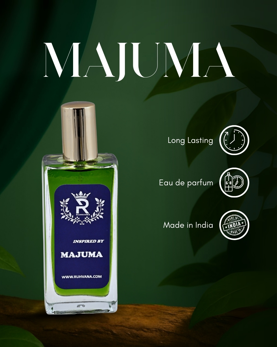 Majuma is a warm, exotic fragrance blending spicy and woody accords for an unforgettable impression. Opening with cardamom, clove, and bergamot, it instantly captivates. The heart reveals saffron, jasmine, and cedar, adding richness, depth, and sophistication. The base of amber, vanilla, and musk ensures a long-lasting, elegant trail. Perfect for evenings, formal events, or intimate gatherings, Majuma is a unisex fragrance that exudes confidence, charm, and sensuality, creating a versatile and alluring signature scent.