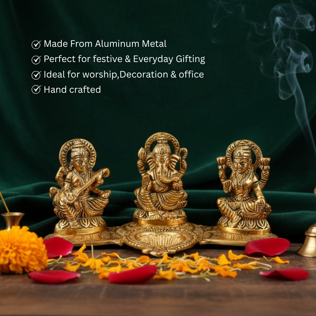• Divine Trio Idol: Features Goddess Lakshmi (prosperity), Lord Ganesha (wisdom & success), and Goddess Saraswati (knowledge) seated together on an oval-shaped base.