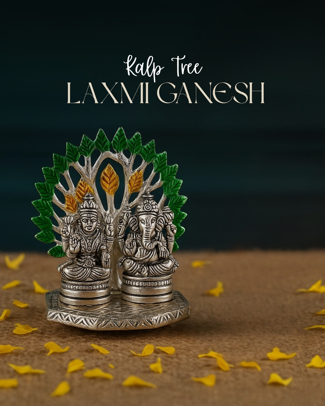 The idol features Goddess Laxmi (symbol of wealth) and Lord Ganesh (symbol of wisdom) seated under the sacred Kalp Tree, representing prosperity, harmony, and success. Its detailed craftsmanship and silver polish make it a spiritual as well as decorative centrepiece.