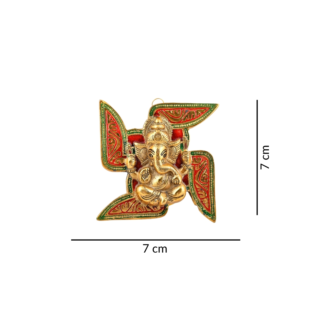 • Swastik Ganesh Wall Hanging (Golden Finish with Mina Work) || Dimensions – 17.78 x 17.78 cm || Weight – 345 g || Material – Aluminium Metal