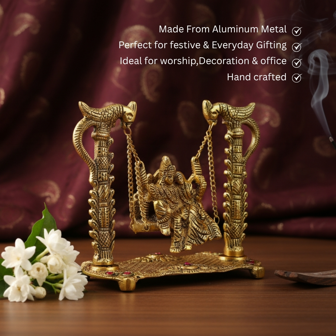 • Symbol of Love & Devotion: Features Radha and Krishna seated on a beautifully crafted swing, symbolizing eternal love, joy, and togetherness.