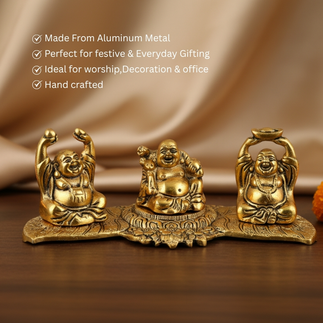 Bring home happiness, positivity, and prosperity with this Golden Aluminium Laughing Buddha Set. The beautifully crafted trio of Laughing Buddhas is designed to uplift the ambiance of any space with their cheerful expressions.