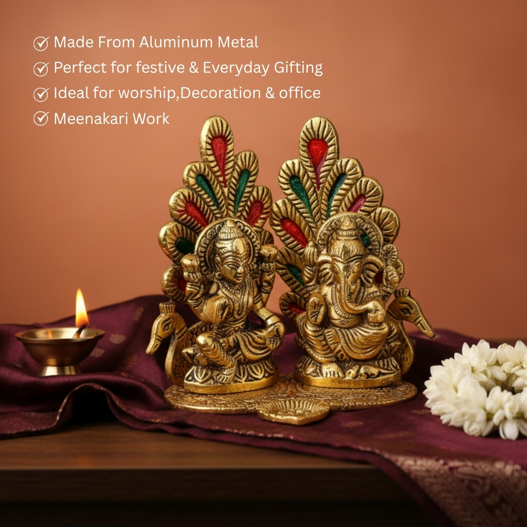 Enhance your home and spiritual space with this Laxmi Ganesh Idol with Peacock Design, crafted with fine detailing in antique golden finish and accented with multi-colour hand painting.