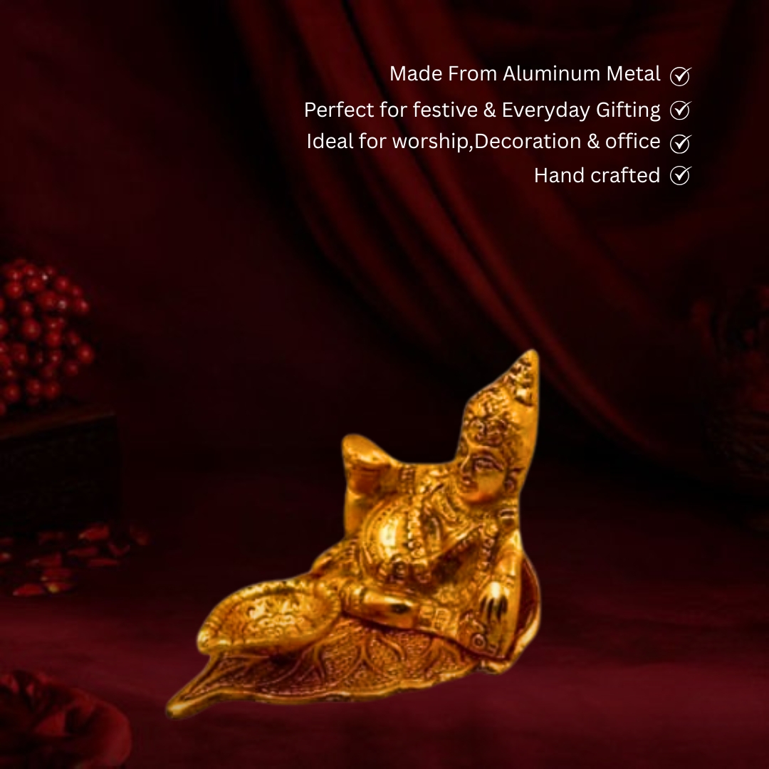 Bring home divine prosperity with this beautifully handcrafted Lord Kuber with Diya Stand, made from high-quality Aluminium Metal in a stunning golden finish. This elegant idol depicts Lord Kuber, the God of Wealth and Abundance, seated gracefully beside a diya stand that symbolizes eternal light and prosperity. Measuring 9 cm in height, 10 cm in length, and 7 cm in width, it fits perfectly in temples, showcases, or work desks. Each detail is delicately designed to reflect fine craftsmanship and sacred artistry. The luminous golden tone adds richness and luxury to your décor while inspiring spiritual peace and positive energy. Perfect as a festive or spiritual gift for your loved ones, this idol brings blessings of financial stability and success. Easy to clean and maintain, simply wipe with a soft dry cloth to preserve its shine for years. A symbol of wealth, light, and devotion, this idol beautifully combines traditional aesthetics with timeless spirituality.