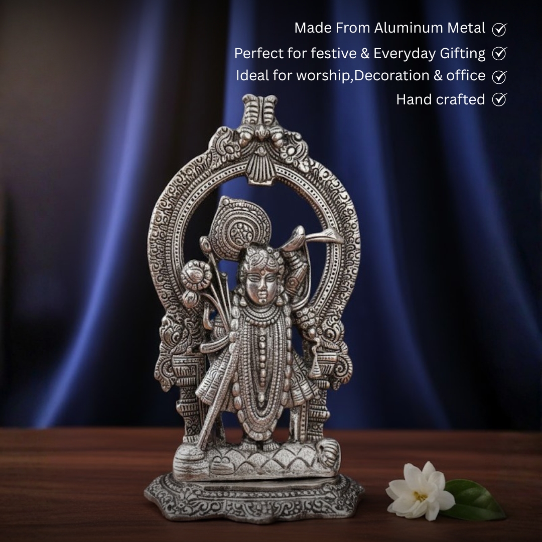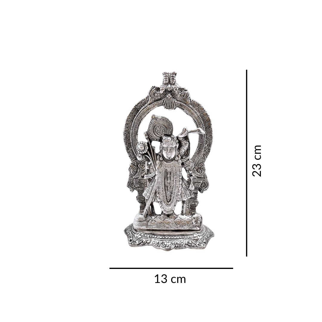 Celebrate divine grace with this elegantly handcrafted Lord Shree Nath Ji idol, made from superior Aluminium Metal with a premium silver finish. Measuring 23 cm in height, 13 cm in length, and 8.5 cm in width, it depicts the divine form of Lord Krishna as Shree Nath Ji, symbolizing love, protection, and eternal devotion. The craftsmanship captures fine detailing of his adornments, posture, and serene expression, creating a spiritually uplifting presence. Its elegant silver sheen complements both traditional and modern décor, making it ideal for pooja rooms, showcases, or home entrances. The idol embodies artistic excellence and sacred symbolism, inspiring peace and divine harmony in any environment. It also serves as a perfect devotional gift for festivals like Janmashtami, Diwali, or auspicious occasions such as weddings and housewarmings. Easy to maintain and long-lasting, simply wipe with a dry cloth to preserve its divine shine. This Shree Nath Ji idol is a timeless symbol of devotion and aesthetic refinement.