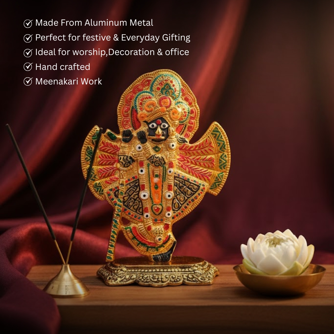 Invite divine joy and devotion into your home with this beautifully handcrafted Bankey Bihari Ji idol, made from durable Aluminium Metal and adorned with a vibrant multi-colour finish. Measuring 21.5 cm in height, 15.3 cm in length, and 8 cm in width, it portrays Lord Krishna in his charming Bankey Bihari form, symbolizing love, happiness, and spiritual bliss. The idol’s rich colours and intricate ornamentation highlight the unmatched artistry of traditional Indian craftsmanship. Perfect for pooja rooms, living spaces, or temples, it brings warmth, serenity, and positivity to any environment. The lifelike expressions and detailed embellishments make it both a devotional and decorative masterpiece. This idol also makes a meaningful gift for Janmashtami, weddings, or festive occasions, spreading blessings of harmony and devotion. To preserve its vivid finish, clean gently with a soft dry cloth. A perfect combination of devotion and design, this Bankey Bihari Ji idol adds a touch of divine charm and artistic beauty to your home.